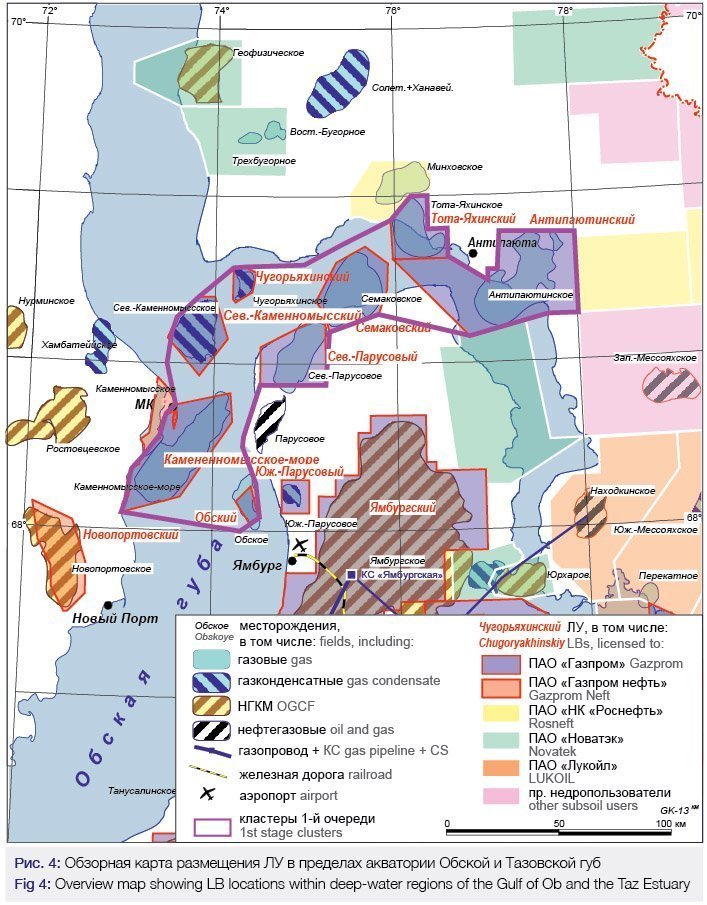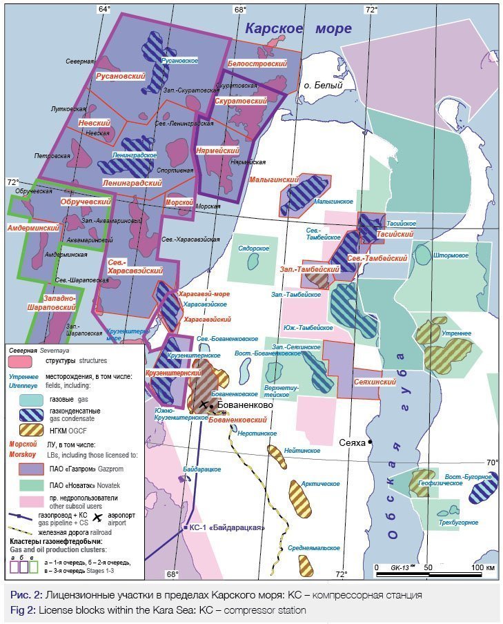 По состоянию на 01.01.2018 ПАО «Газпром» на карском шельфе (в том числе в акватории Обской и Тазовской губ) владеет лицензиями на 22 участка недр, из них 15 ЛУ с нефтегазоперспективными структурами и месторождениями УВ охватывают всю приямальскую часть карского шельфа от о. Белый на севере почти до Байдарацкой губы на юге. Здесь в транзитных зонах суша-море завершается разведка уникальных по запасам газоконденсатных месторождений УВ – Харасавэйского и Крузенштернского (рис. 2), а на суше Ямала разрабатывается уникальное Бованенковское нефтегазоконденсатное месторождение (НГКМ).