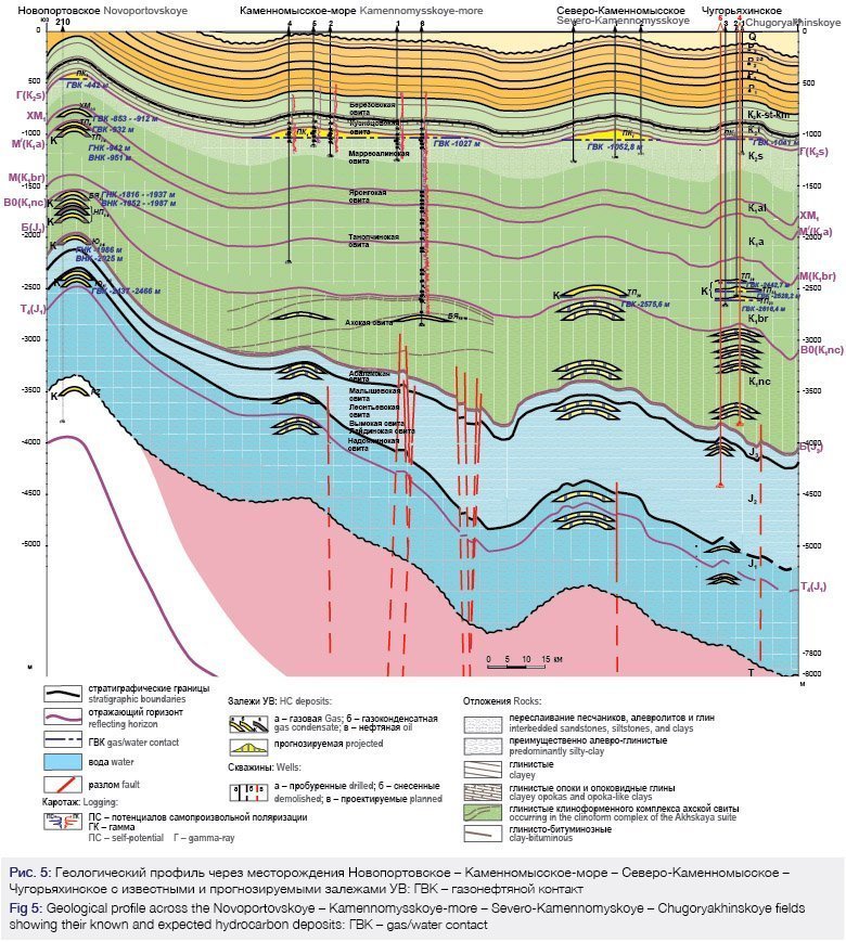 В акваториях Обской и Тазовской губ объективно намечаются два кластера газонефтедобычи. Первоочередной кластер (рис. 4) включает в себя подготовленные к разработке месторождения Каменномысское-море, Северо-Каменномысское, Обское, Чугорьяхинское, Семаковское, Тота-Яхинское, Антипаютинское и Северо-Парусовое, охваченные единой транспортной системой сбора УВ. Последнее расположено в пределах ЛУ, большая часть которого охватывает сушу. Запасы газа по кат. С1+ С2 этого кластера составляют 1,9 трлн м3, конденсата – 8,4/5,6 млн т (геол./извл.), при этом основные запасы газа содержатся в следующих месторождениях, млрд м3: Каменномысское-море – 544,7; Северо-Каменномысское – 431,9; Антипаютинское – 340,4 и Семаковское – 320,5. Конденсат содержится только в неокомских залежах Северо-Каменномысского и Чугорьяхинского месторождений. Ресурсы газа и конденсата числятся только в пределах Антипаютинского и Тота-Яхинское участков. По Антипаютинскому участку ресурсы газа по подсеноманским отложениям совместно по кат. D0 и Dл оцениваются в 0,8 трлн м3, по конденсату – 87/60,9 млн т (геол./извл.). По Тота-Яхинскому участку ресурсы газа совместно по кат. D0 и Dл составляют 250,9 млрд м3, конденсата – 27,8/19,5 млн т (геол./ извл.). В перспективе для указанных месторождений актуальной задачей будет доразведка открытых подсеноманских газоконденсатных залежей и выявление новых залежей УВ – газоконденсатных, нефтегазоконденсатных и, возможно, нефтяных в нижнемеловых и юрских отложениях (рис. 5).