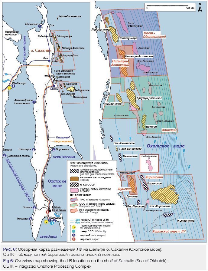 В Дальневосточном регионе России в ближайшие десятилетия предусматривается освоение высокоперспективного присахалинского шельфа Охотского моря. Здесь ПАО «Газпром» контролирует 7 ЛУ, из них 6 находятся на северо-восточном шельфе о. Сахалин (рис. 6) и один – на шельфе Западной Камчатки. Два участка – Лунский и Пильтун-Астохский – осваиваются ПАО «Газпром» совместно с другими компаниями.