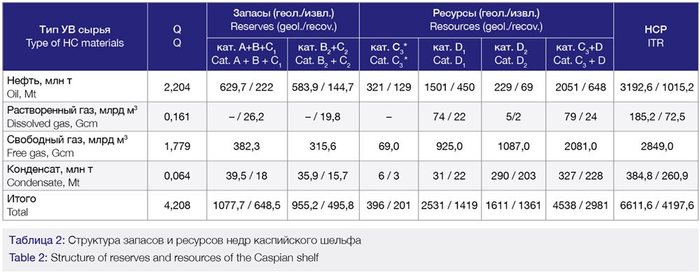 НСР УВ российского шельфа в Каспийском море, по официальной оценке, составляют 6,6/4,2 млрд т у. т. (геол./извл.). НСР свободного газа оцениваются в 2,8 трлн м3, конденсата – 384,8/260,9 млн т (геол./ извл.), нефти – 3,2/1,0 млрд т (геол./извл.), растворенного газа – 185,2/72,5 млрд м3 (геол./извл.) (см. табл. 1).