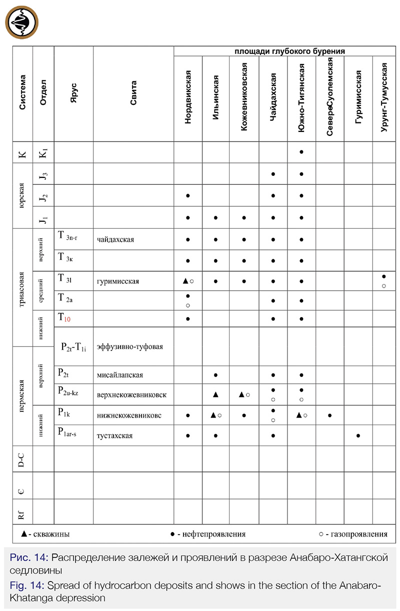 На территории Анабаро-Хатангской НГО известны четыре мелких нефтяных месторождения в верхнепалеозойских и нижнемезозойских образованиях на Южно-Тигянской, Нордвикской, Кожевниковской и Ильинской площадях, незначительные притоки УВ получены на Чайдахской площади.