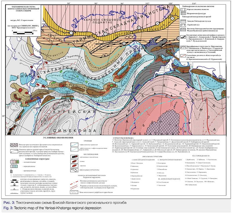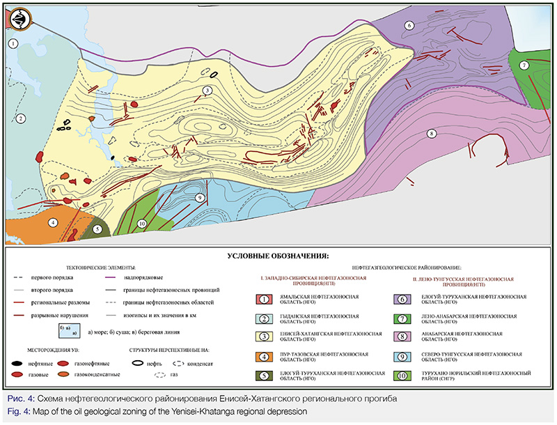 Как отмечалось ранее, повышенный интерес с точки зрения приобретения новых лицензионных участков представляют окраинные части Западно-Сибирского бассейна, где присутствуют все необходимые геологические факторы, определяющие возможность формирования и сохранения месторождений. Наиболее перспективна в этом отношении, на наш взгляд, территория Енисей-Хатангского регионального прогиба, который является, как видно на тектонической схеме (Рис.3), «ответвлением» Западно-Сибирского бассейна и имеет идентичный геологический разрез и глубины залегания нефтегазоносных комплексов. В ее пределах выделяется две основные нефтегазоносные области: Енисей-Хатангская в западной и Анабаро-Хатангская в восточной части прогиба (Рис.4).