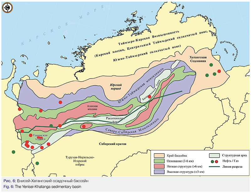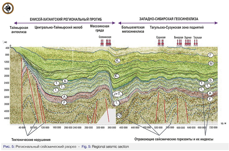 Енисей-Хатангский нефтегазоносный осадочный бассейн охватывает крайнюю северо-западную часть Сибирской платформы. Как видно на региональном сейсмическом разрезе, он имеет геологический разрез, идентичный Западно-Сибирскому бассейну (Рис.5) и относится к перспективным на нефть и газ территориям.
