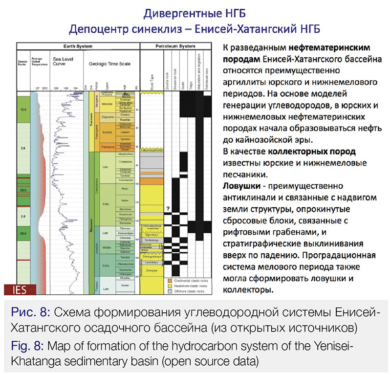 В наиболее изученной западной части Енисей-Хатангской НГО открыты 15 месторождений нефти и газа, залежи выявлены в отложениях нижнего мела, средней и верхней юры. По характеру распределения коллекторов и флюидоупоров, а также нефтегазопроявлений, в разрезе юрско-меловых отложений Енисей-Хатангской НГО выделено 7 региональных нефтегазоносных комплексов (НГК) (Рис.8): зимний, джангодский, вымский, малышевский, нижнемеловой, долганский и насоновский, продуктивность которых установлена в западной части НГО. В восточной, слабо изученной, части НГО газопроявления приурочены лишь к зимнему и вымскому комплексам.