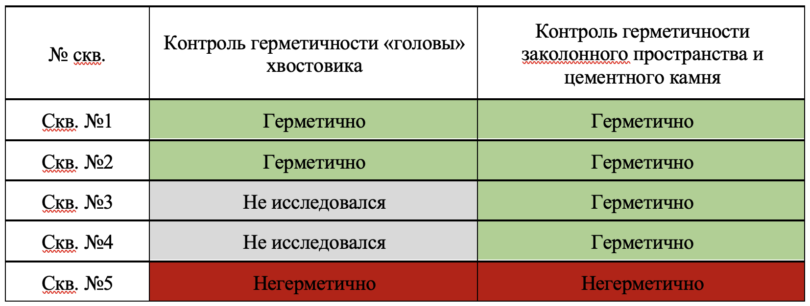 Ниже представлены результаты проделанной работы по определению герметичности «головы» хвостовика, заколонного пространства и цементного камня: