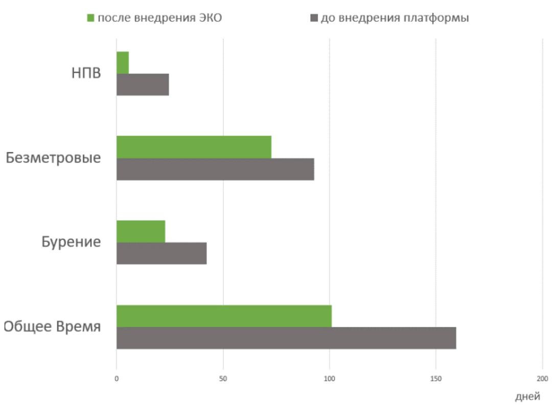 Результат качественного подготовительного процесса, прозрачность и вовлечение всех подрядных организаций в работу с ЭКО позволило в разы увеличить производительность. Предиктивная аналитика, основанная на живой, многодисциплинарной физико-математической модели, выявила на ранних стадиях и позволила избежать ряд осложнений: катастрофические поглощения, техногенные трещины, и позволило сохранить целостность — качество открытого ствола скважины. Онлайн анализ дисфункций бурения, и оптимизация технологических параметров, позволила пробурить скважины с проходкой, двукратно превышающей результат предыдущих работ. Ежедневные автоматизированные сводки ключевых показателей эффективности и анализ отклонений в реальном времени позволили минимизировать непроизводительное время, сократив время без метровых внутрискважинных операций на 80%. Результат общего времени, затраченного на строительства скважины, улучшился на 35% в сравнении со скважинами до внедрения ЭКО. Данные бурения, каротажа, отбора керна и анализа шлама, геологических исследований и работ по креплению обсадных колон доступны клиенту для последующего анализа, планирования дальнейшего бурения, и доступны в цифровом формате для ввода месторождения в эксплуатацию.