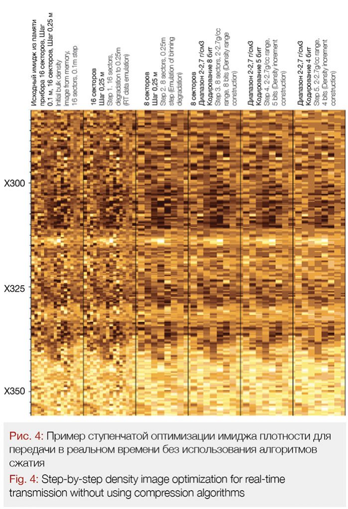 На начальном этапе промышленного использования было предложено интересное решение, которое позволило передавать приемлемое качество имиджа плотности без алгоритмов сжатия. Для реализации передачи имиджа плотности без сжатия было решено идти по пути оптимизации самого массива. Другими словами, необходимо уменьшить размер массива до минимального. При этом минимальный размер обязательно должен удовлетворять условию выполнения поставленной задачи – оценки угла залегания пластов в направлении бурения. Оптимизация выполнялась поэтапно с контролем результата на каждом этапе: