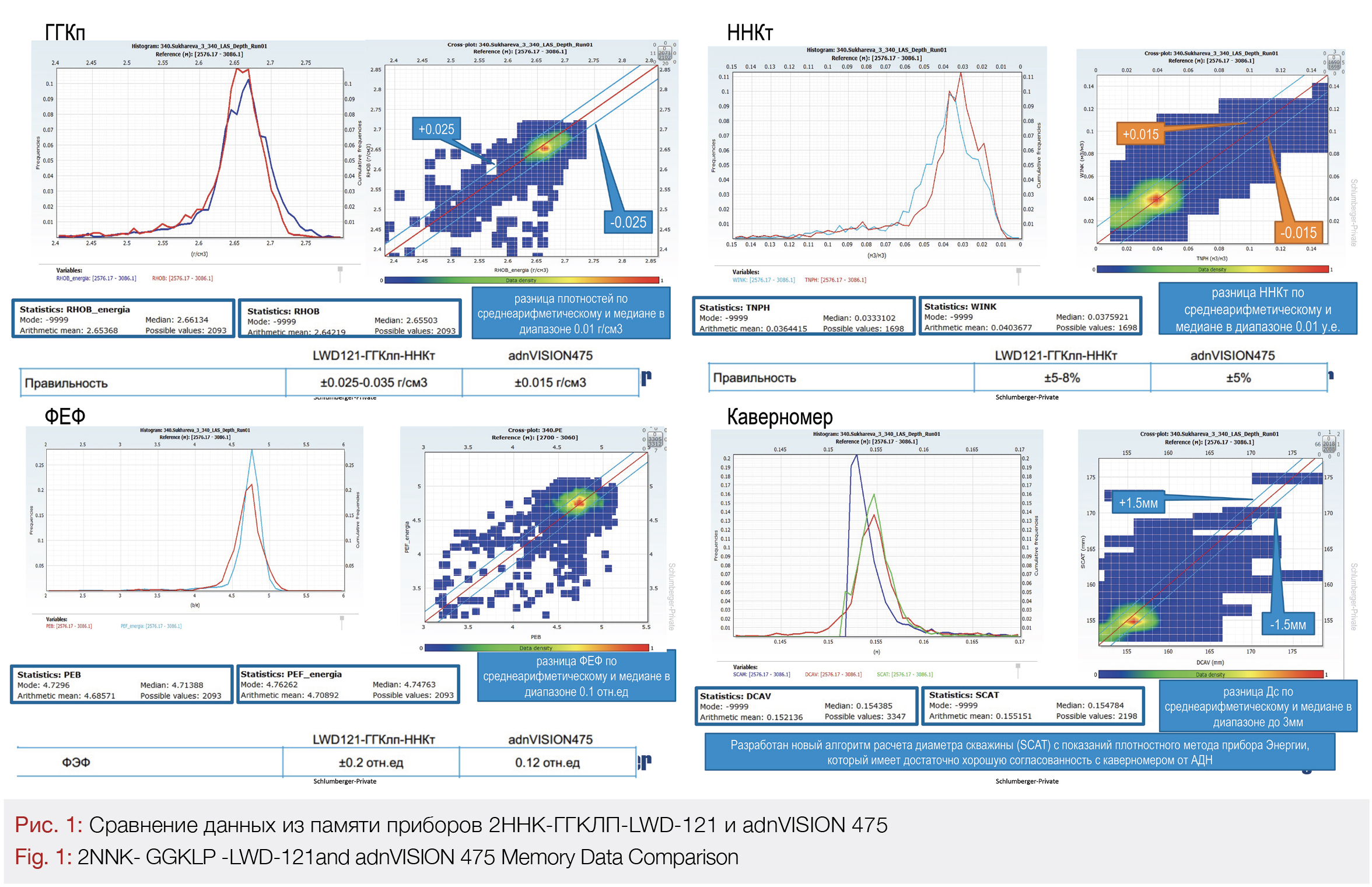 В апреле 2019 года проведено первое опытно-промышленное испытание зонда ЗАО «НПП Энергия» LWD121-2ННК-ГГКЛП (4.75”) в единой связке с прибором нейтронно-плотностного каротажа adnVISION475 в карбонатном разрезе. Выполнено прямое сопоставление измеряемых параметров. Сопоставление методов ГГКлп, ННКт, Имидж, Каверномер из памяти обоих приборов показал сходимость в пределах паспортной погрешности измерений (Рис.1). Сопоставление паспортных характеристик приборов представлены в Таблице 1.