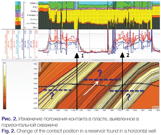 Положение флюидальных контактов также определить нельзя, поскольку в случае единого плоского контакта в залежи ГС пройдет параллельно ему. С другой стороны, поскольку горизонтальные скважины, как правило, относятся к эксплуатационному фонду и бурятся на разных этапах разработки месторождения, информация, полученная в ГС, позволяет оценить распределение начальной насыщенности под действием капилярных явлений или ее изменение в процессе разработки. На рис. 2 приведен пример прорыва воды по средней части пласта, представленной породами с улучшенными фильтрационно-емкостными свойствами, тогда как соседние интервалы пласта еще не обводнились, хотя и были затронуты разработкой. Такую информацию, изменившую представление о поведении флюидов в пласте, нельзя получить при исследовании одной вертикальной скважины. Так, скв. 1 на рис. 2 вскроет нефтяную зону только верхнего пласта, а скв. 2 – всех трех пластов, что не позволит сразу обнаружить неравномерный подъем контакта.
