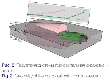 Вторым источником неопределенности является неприменимость методик количественной оценки свойств пластов по данным ГИС без их специ-альной обработки. Это связано с усложнением геометрии системы скважина – пласт, влияющим на показания регистрируемых при ГИС физических величин и приводящим к нечетким каротажным характеристикам границ пластов и других неоднородностей разреза (например, конкреций сцементированных песчаников). Как показано на рис. 3, при пересечении пласта под небольшим углом область исследования каротажных приборов будет включать несколько пластов, и сама скважина может частично находиться в одном пласте, частично – в другом. Без информации о геологическом строении и особенностях залегания пластов невозможно определить, какой из них больше влияет на показания интегрального прибора. Существенное влияние на регистрируемые данные оказывают переслаивание и особенности вмещающих пород. В отличие от вскрытия пластов вертикальной скважиной в горизонтальных скважинах анизотропия, в разной степени свойственная практически всем геологическим разностям, значительно в большей степени отражается на каротажных данных, что является одной из ключевых проблем для прогноза характера насыщения и динамических свойств объектов исследования. Форма стенок и геометрия горизонтальной скважины в значительной мере определяют необходимые поправки на условия измерения в показания методов ГИС. Желобы, вывалы, овализация, уступы и другие осложнения формы ствола должны тщательно учитываться и контролироваться при помощи данных азимутальной кавернометрии и других методов LWD.