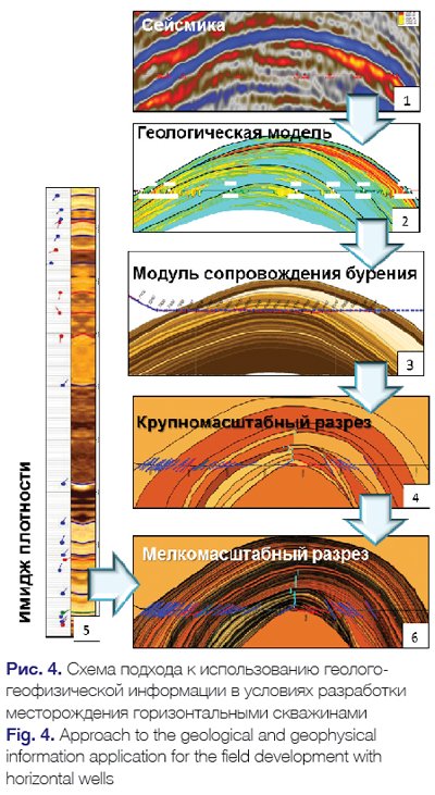 Основной принцип данного подхода заключается в комплексировании разномасштабных данных (рис. 4). Так, основное представление о геологическом строении продуктивных отложений, полученное на основании сейсмических данных 1 используется для создания базовой геолого-геофизической модели 2. На основании этой модели проектируются траектории скважин и выполняется предварительный прогноз свойств до начала бурения. При получении новых данных каротажа как в процессе бурения, так и из памяти приборов проводятся корректировка в интервалах, пройденных скважиной, и пепесмотр прогнозов для еще не вскрытых интервалов. Положение границ геологических тел уточняется путем сравнения прогнозных и зарегистрированных каротажных данных и постоянного обновления разреза вдоль траектории скважины в геонавигационном программном обеспечении 3. По результатам всестороннего анализа получаемой информации может быть принято решение об изменении геологических целей, плановой траектории и схемы заканчивания скважины.