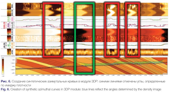 К сожалению, в настоящее время отсутствует возможность автоматизированного учета имиджа каверномера при обработке кривых ГИС, поэтому одной из задач интерпретатора должна быть оценка влияния состояния ствола скважины и подбор наиболее достоверных свойств элементов разреза на несовершенных участках скважины. При этом в части разреза, выделенной нас рис. 6 зеленым цветом, видно, что определение угла по имиджу плотности не всегда достоверно, тогда как применение алгоритмов решения прямой задачи для кривых плотности по верхнему и нижнему квадрантам позволяют уменьшить неопределенность в оценке угла пересечения пласта и скважины и скорректировать положение геологических границ.