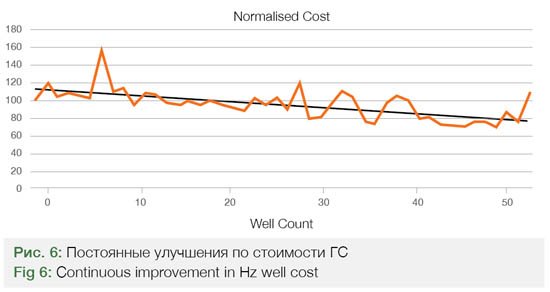 Первоначально стоимость ГС значительно превышала стоимость стандартной (в основном за счет затрат, связанных со временем), однако тренд на рис. 6 показывает, что стоимость указанных скважин снизилась на 35% т и теперь превышает стоимость стандартных скважин на 40%.
