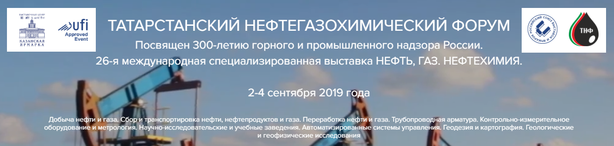 Со 2 по 4 сентября 2019 года на территории ВЦ «Казанская ярмарка» состоится Татарстанский нефтегазохимическийфорум, который будет посвящен 300-летию горного и промышленного надзора России. В рамках Форума будут работать 3 отраслевые выставки: «Нефть, газ. Нефтехимия», «GEO-КАЗАНЬ», «Интерпластика Казань» и впервые планируется организация павильона специализированной выставки по химическому машиностроению, биотехнологиям и защите окружающей среды «ACHEMA».
