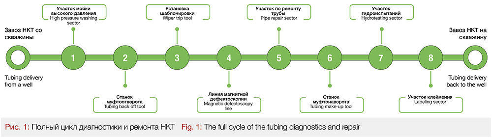 Классическим решением производства работ по диагностике и ремонту НКТ является прохождение полного цикла по линии предварительной мойки (очистка НКТ от скважинной жидкости после завоза НКТ со скважины) и мойки высокого давления (очистка внутренней поверхности НКТ от отложений), станка муфтоотворота, установки шаблонировки труб (контроль внутреннего диаметра НКТ), линии магнитной дефектоскопии (контроль толщины стенки НКТ и наличия дефектов), трубонарезной установке, участка муфтонаворота, гидроиспытания и клеймения (рис. 1).
