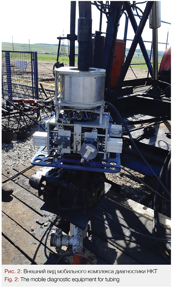 Диагностический модуль устанавливается на спайдер (предназначен для захвата и удержания на весу колонны НКТ), так, чтобы колонна НКТ проходила через него (рис. 2) и коммутируется с помощью кабеля с аппаратно-программным комплексом установки. При подъеме труб из скважины одновременно обеспечивается неразрушающий контроль тела, информация о годности труб выдается с помощью световой сигнализации, при этом существует возможность просмотра первичных данных контроля и архивирования информации на диске компьютера. Для контроля НКТ отличного диаметра необходимо произвести замену блока датчиков под соответствующий типоразмер труб. После монтажа диагностического модуля возникает необходимость подъема настилаемой на устье скважины рабочей площадки, гидравлического ключа (ГКШ) и рабочей площадки старшего оператора подземного ремонта скважин. Перед началом работ и при замене блока датчиков необходимо провести настройку чувствительности датчиков с использованием контрольных образцов НКТ. Время, затрачиваемое на монтаж, демонтаж диагностического комплекса и настройку чувствительности датчиков, в среднем составляет не более 40 минут на один ремонт.