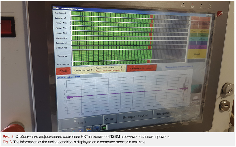 В процессе опытно-промысловых работ оценивалась работоспособность, корректность работы модуля дефектоскопии и изменение продолжительности подземного ремонта скважины. В процессе извлечения НКТ из скважины производится их дефектоскопия (инспекция), с отображением результатов контроля на мониторе ПЭВМ в режиме реального времени (рис. 3) и подачей соответствующего светового (красный – брак, зеленый – годная) и звукового сигналов. По результатам дефектоскопии НКТ производится сортировка труб на годные и бракованные. После отворота бракованной НКТ и укладки на мостки на нее наносилась метка для последующего детального осмотра. После полного подъема, колонны НКТ вывозились в полном объеме в сервисные цеха по ремонту глубинно-насосного оборудования для проведения полного цикла ремонта и диагностики и сопоставления полученных данных в процессе спуско-подъемных операций и с использованием стационарных комплексов в условиях трубных баз.