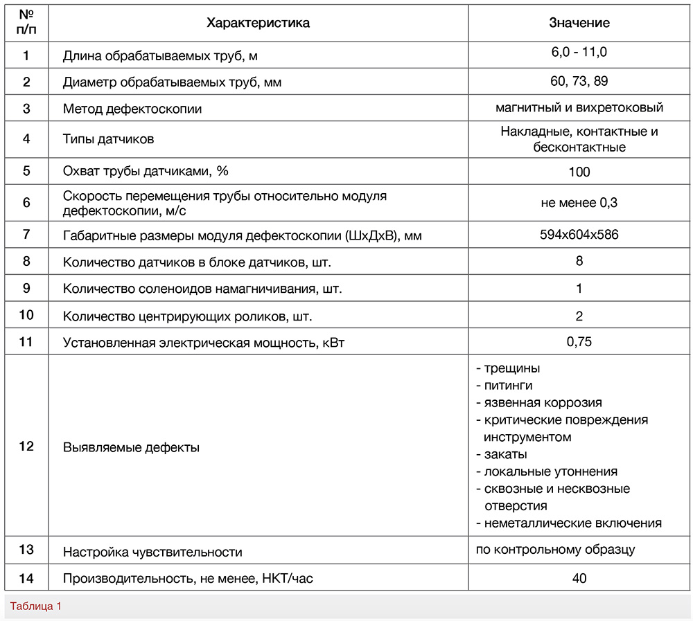 На следующем этапе, по результату изучения положительного зарубежного опыта Центром технологического развития совместно с НГДУ «Елховнефть» были запланированы испытания мобильного комплекса неразрушающего контроля. Данный комплекс предназначен для автоматизированного неразрушающего контроля насосно-компрессорных труб методом магнитной и вихретоковой дефектоскопии в процессе проведения спускоподъемных операций (далее СПО) на устье скважины бригадами текущего и капитального ремонта скважин. При этом он позволяет выявлять дефекты на наружной и внутренней поверхностях НКТ, а также в теле металла трубы. Основные технические характеристики комплекса представлены в таблице 1.
