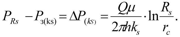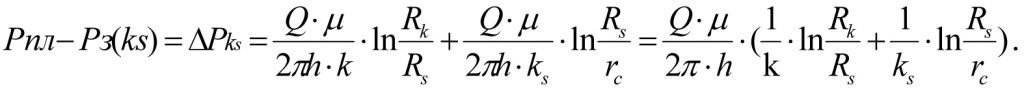 Более привлекательным является вывод формулы для расчета ∆Ps с учетом потери давления при плоскорадиальной фильтрации пластовой жидкости в зонально-неоднородном (по проницаемости) пласте в интервале контура питания (Rk-Rs) с проницаемостью пласта k и в скин-слое (Rs-rc) с проницаемостью ks.
