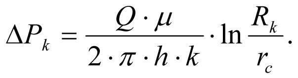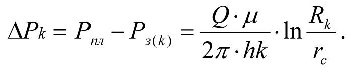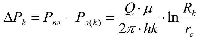 Следовательно, ΔРk — падение пластового давления при фильтрации жидкости в околоскважинном пространстве прямо пропорционально натуральному логарифму отношения радиуса контура питания пласта Rk к радиусу скважины rc, и обратно пропорционально коэффициенту проницаемости k пласта.