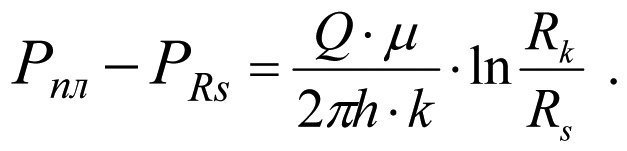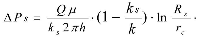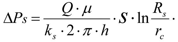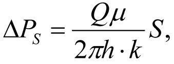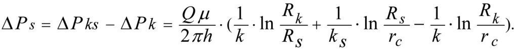 где ΔРs — дополнительные потери пластового давления при фильтрации жидкости в скважину из-за ухудшения проницаемости пласта в скин-слое от k до ks; µ — динамическая взякость пластовой жидкости Q; S — значение скин-фактора.