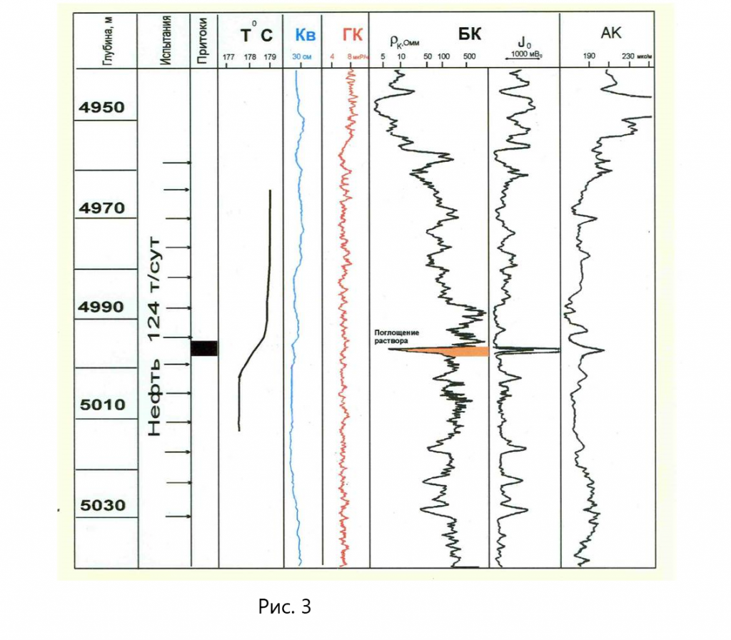 - При освоении объекта в интервале 3640-3672 м приток вначале отсутствует; приём воды отмечен при давлении 20 МПа. После первой СКО – перелив воды дебитом 4 м3/сут; после второй СКО – приток нефти с водой при забойном давлении Рзаб = 25 МПа; после третьей СКО – фонтан нефти дебитом 100 т/сут при Рзаб = 30 МПа.