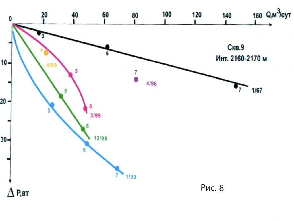 - Рис. 8 иллюстрирует индикаторные диаграммы (ИД) и динамику их изменений во времени по объекту, сложенному трещинными терригенными породами и метаморфизованными сланцами. Скважина пробурена и освоена в 1967 г. Небольшие депрессии при высоком дебите и прямолинейная ИД указывают на хорошую прочистку трещин и неизменный коэффициент продуктивности для штуцеров разного диаметра. Из-за необустройства промысла скважина находилась в консервации до 1994 г. Следующие полноценные гидродинамические исследования выполнены в 1999 г. За период 1994-1999 г. в залежи неоднократно повторялись этапы упруго-пластического деформирования и разрушения пород матрицы. В январе 1999 г. ИД расположилась значительно левее первоначальной и искривляется к оси дебитов.Снижение забойного давления при увеличении диаметра штуцера увеличивает сжатие пород растущим тангенциальным напряжением и логичнее наблюдать изгиб ИД к оси депрессий. В данном случае в области питания скважины проходит этап разрушения пород и образования новых трещин,который интенсифицируется сжатием тангенциальным напряжением с образованием дополнительных трещин непосредственно в процессе исследований. Гидродинамические исследования через 2 месяца показали сдвиг ИД вправо и вверх,что свидетельствует о преобладании за прошедшее время в объёме пород,влияющих на работу скважины, процесса образования новых трещин (т.е. процесса разрушения пород).В момент проведения самих исследований переход к штуцеру d =6 мм вызвал искривление ИД к оси депрессий и уменьшение продуктивности,что обусловлено снижением раскрытости трещин под действием растущего тангенциального напряжения в процессе упругого деформирования пород.Одиночный замер на штуцере d =4 мм в следующем месяце показал рост продуктивности и доминирующее влияние процесса образования новых трещин. В конце 1999 г. ИД указывает на снижение продуктивности.После апреля 1999 г. процесс разрушения пород и образования новых трещин подошёл к концу и начался новый этап упруго-пластических деформаций, что повлекло за собой снижение раскрытости трещин и их проницаемости. Прямолинейный вид ИД отражает временное равновесное состояние между уменьшением раскрытия трещин и увеличением их концентрации в единице объёма пород. Пластовое давление в залежи постепенно снижалось и меры по его повышению не принимались.