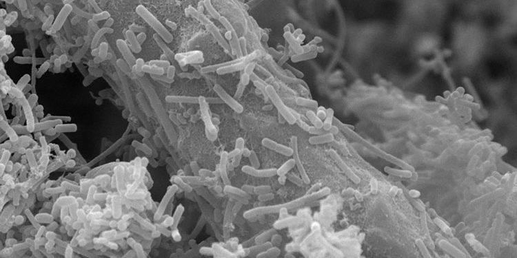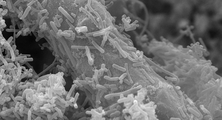 Рис. Иммобилизованные бактерии на поверхности волокон полимерной матрицы и в межволоконном пространстве (сканирующая электронная микроскопия)