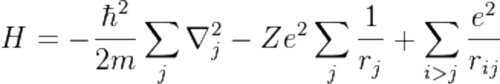 Здесь m — масса электрона, е — его заряд, rj — абсолютная величина радиус-вектора j-го электрона, ħ – постоянная Планка. Первое слагаемое выражает кинетическую энергию электронов, второе слагаемое — потенциальную энергию кулоновского взаимодействия электронов с ядром и третье слагаемое — потенциальную кулоновскую энергию взаимного отталкивания электронов. Суммирование в первом и втором слагаемом ведется по всем Z электронам. В третьем слагаемом суммирование идёт по всем парам электронов, причём каждая пара встречается однократно [12]. Константа Планка ħ, значение которой фиксирована и равна 6,626 x 10–34 Дж·с — это порция электромагнитной энергии, соответствующая одному кванту. Постоянная Планка ħ определяет границу между макромиром, где действуют законы механики Ньютона, и микромиром, где действуют законы квантовой механики.