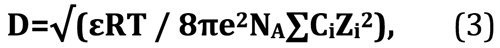 где ε — диэлектрическая постоянная; R — газовая постоянная, 8,3 Дж\(моль*Кл); Т — абсолютная температура; Z — заряд иона; F — число Фарадея, 96400 Кл \ моль; С — концентрация ионов, моль – ион \ литр; ε0 — электрическая константа, 8,85 *10-12Ф/м.