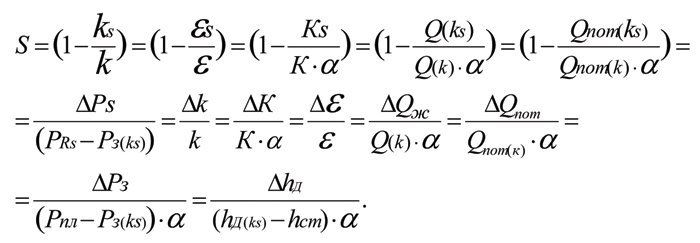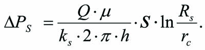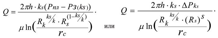 где ΔРs — дополнительные потери пластового давления при фильтрации жидкости к забою скважины из-за ухудшения проницаемости пласта в скин-слое от k до ks; µ — динамическая взякость пластовой жидкости Q; S — значение скин-фактора. Параметр ΔРs имеет важное значение и входит при выводе формул всех базовых гидродинамических параметров зонально-неоднородного пласта.