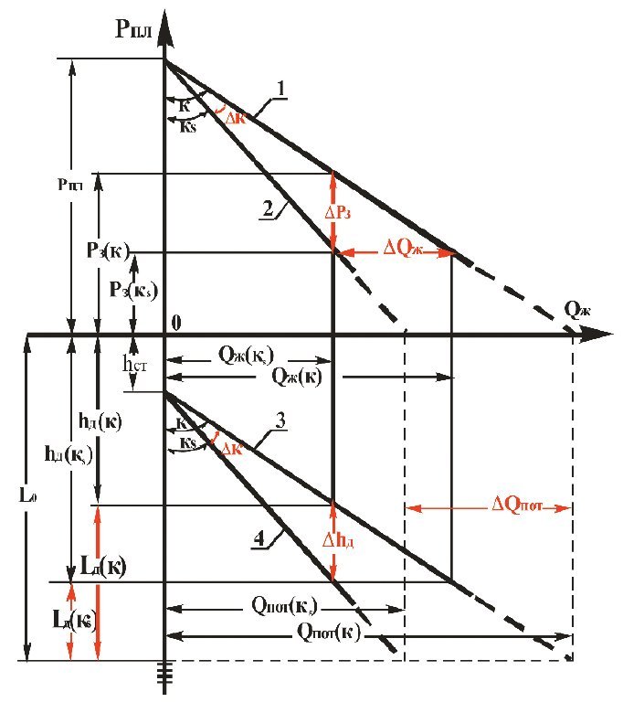 4 — индикаторная линия hд=f(Qж(кs)); К – коэффициент продуктивности при естественной проницаемости пласта k; Кs — коэффициент продуктивности при ухудшенной проницаемости пласта ks; Qж(к) – приток жидкости при продуктивности пласта К; ΔК – снижение продуктивности в результате ухудшения проницаемости пласта от k до ks; Qж(кs) – приток жидкости при продуктивности пласта Кs; ΔQж – снижение притока в результате ухудшения продуктивности пласта от К до Кs; hст – статический уровень жидкости в скважине; hд(к) – динамический уровень жидкости в скважине при продуктивности пласта К; hд(кs) – динамический уровень жидкости в скважине при продуктивности пласта Кs; Δhд – снижение динамического уровня жидкости в скважине в результате ухудшения продуктивности пласта от К до Кs; L – глубина скважины до верхних перфорационных отверстий; Lд(к) –динамическая глубина при продуктивности пласта К; Lд(кs) –динамическая глубина при продуктивности пласта Кs; ΔРз – снижение забойного давления в результате ухудшения продуктивности пласта от К до Кs; Qпот(к) – потенциальный дебит при продуктивности пласта К; Qпот(кs) – потенциальный дебит при продуктивности пласта Кs; ΔQпот – снижение потенциального дебита в результате ухудшения продуктивности пласта от К до Кs.