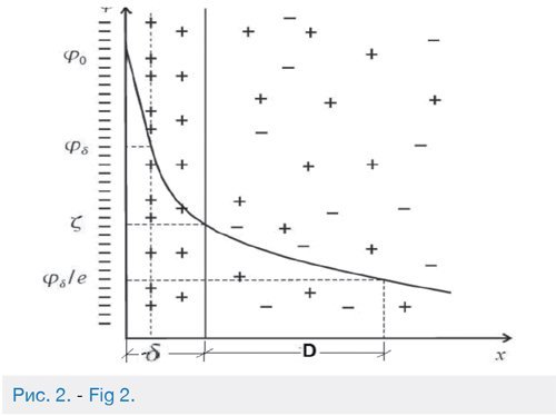 Образующийся двойной слой можно подразделить на плотную часть δ (слой Гельмгольца), образуемый ионами, прилегающими непосредственно к поверхности стенки капилляров породы, и диффузную часть (слой Гуи) D. В результате электростатического притяжения ионов заряженной поверхностью, с одной стороны, и хаотического теплового движения молекул, под влиянием которого ионы стремятся равномерно распределиться в нефти, – с другой, ионная часть приобретает диффузное строение. Концентрация ионов, несущих заряд, противоположный заряду поверхности породы, уменьшается по мере удаления от поверхности, а концентрация ионов, имеющих заряд, одинаковый по знаку с зарядом породы, возрастает по мере удаления от поверхности (рис.2). Слой Гельмгольца или адсорбционный слой, примыкающий непосредственно к межфазной поверхности имеет толщину δ, равную радиусу потенциалопределяющих ионов [13].