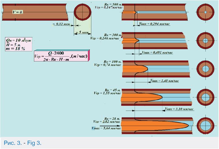 Указываются исторические ошибки и заблуждения, допущенные в формулах для определения скин-фактора, потери давления и притока в скин-слое при фильтрации жидкости. В связи с этим дается подробный и последовательный аналитический вывод его формулы. 1-Аналитический вывод формулы скин-фактора подтверждается в пяти вариантах выводами: 2- через индикаторные линии «дебит – давление», 3 — «дебит – уровень», 4 — по значениям забойного давления и 5 — потенциального дебита, 6 — приводится вывод формулы скин-фактора для зонально-неоднородного пласта [3,4,5]. Выведена зависимость для оценки влияния радиуса скин-слоя и коэффициента проницаемости на величину притока жидкости в скважину.
