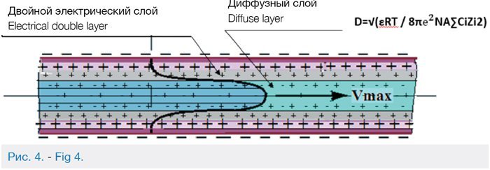 На рис. 4 схематично показан двойной электрический слой в капиллярах породы, содержащий слой Гельмгольца и диффузный слой.