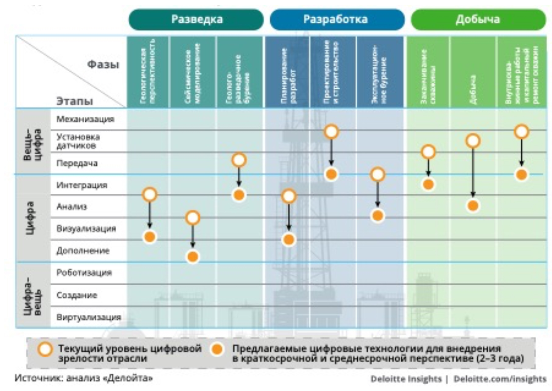 Еще в 2017 году, согласно анализу Deloitte, приведенному в официальном документе «От байтов к баррелям», нефтегазовая отрасль все еще находилась на уровне «подросткового» уровня зрелости, на волосок ниже предполагаемого. В то же время, согласно анализу Deloitte, при строительстве и освоении скважин, опережение бурения превалировало.
