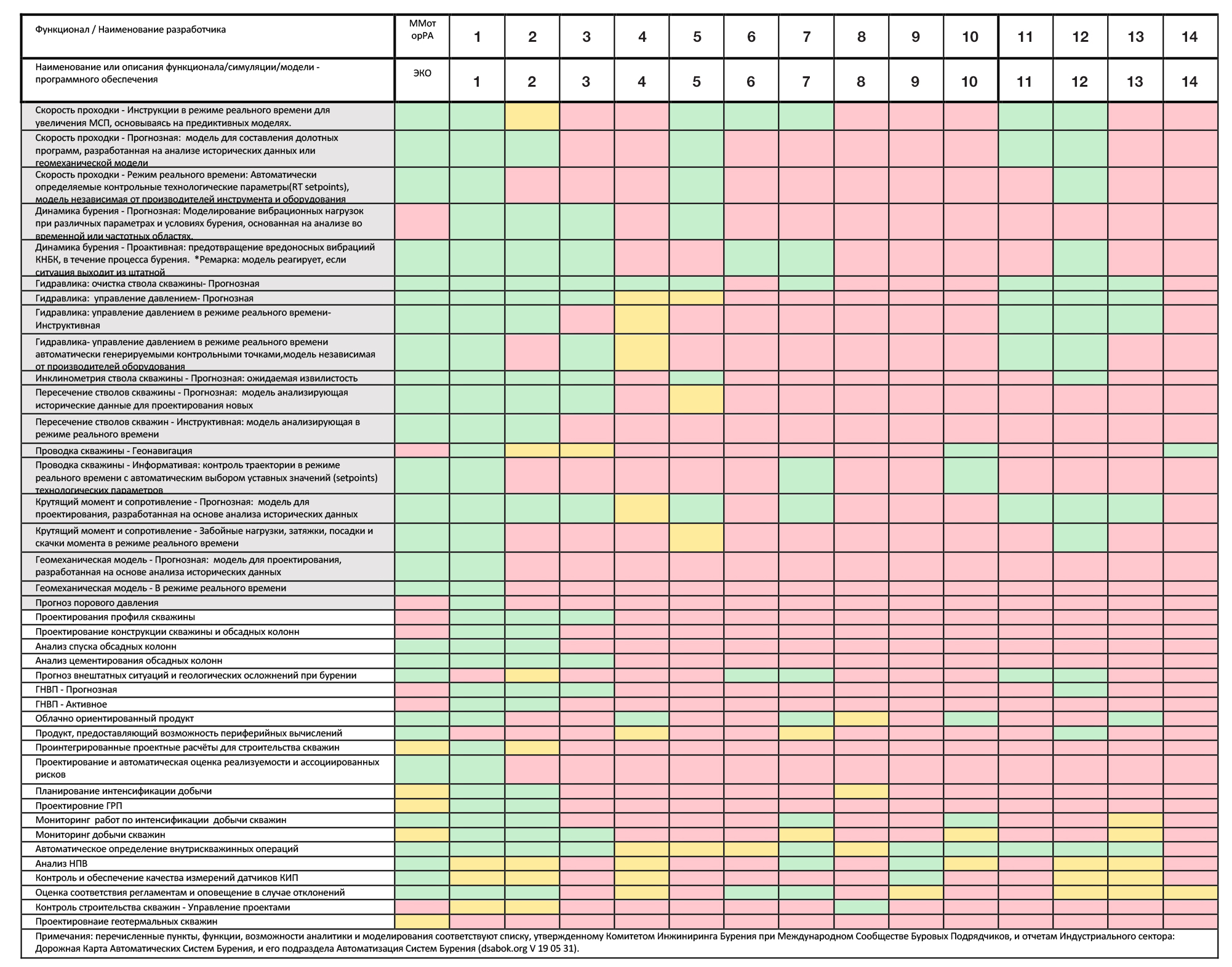 Эти шаги практически являются требованиями к программному обеспечению. Действительно, они не охватывают все обсуждаемые выше аспекты, хотя, по нашему мнению, все же покрывают почти половину из них. Для определения текущего состояния отрасли мы объединили последний опубликованный список критических функций и функций, необходимых для автоматизации, с мнениями экспертов и внутренним видением WellsX. Полученный список сравнивался с заявленными функциями, результатами и базовыми программными технологиями основных коммерчески доступных поставщиков отраслевых программных решений (см. Рисунок 2). Полученная картинка, это должно быть подчеркнуто, составлена из доступной нам информации.