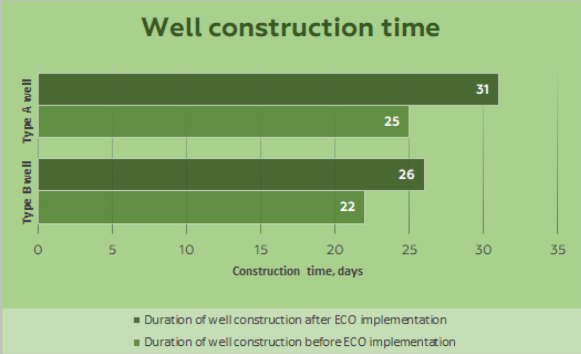 Achieved improvements in feet drilled per day, and in overall per, well construction time vary depending on the types of wells and drilling scales. In the case of sidetracking (well type A), the acceleration, in general, was 20%, and during the construction of directional wells (well type B), on average – 16%.