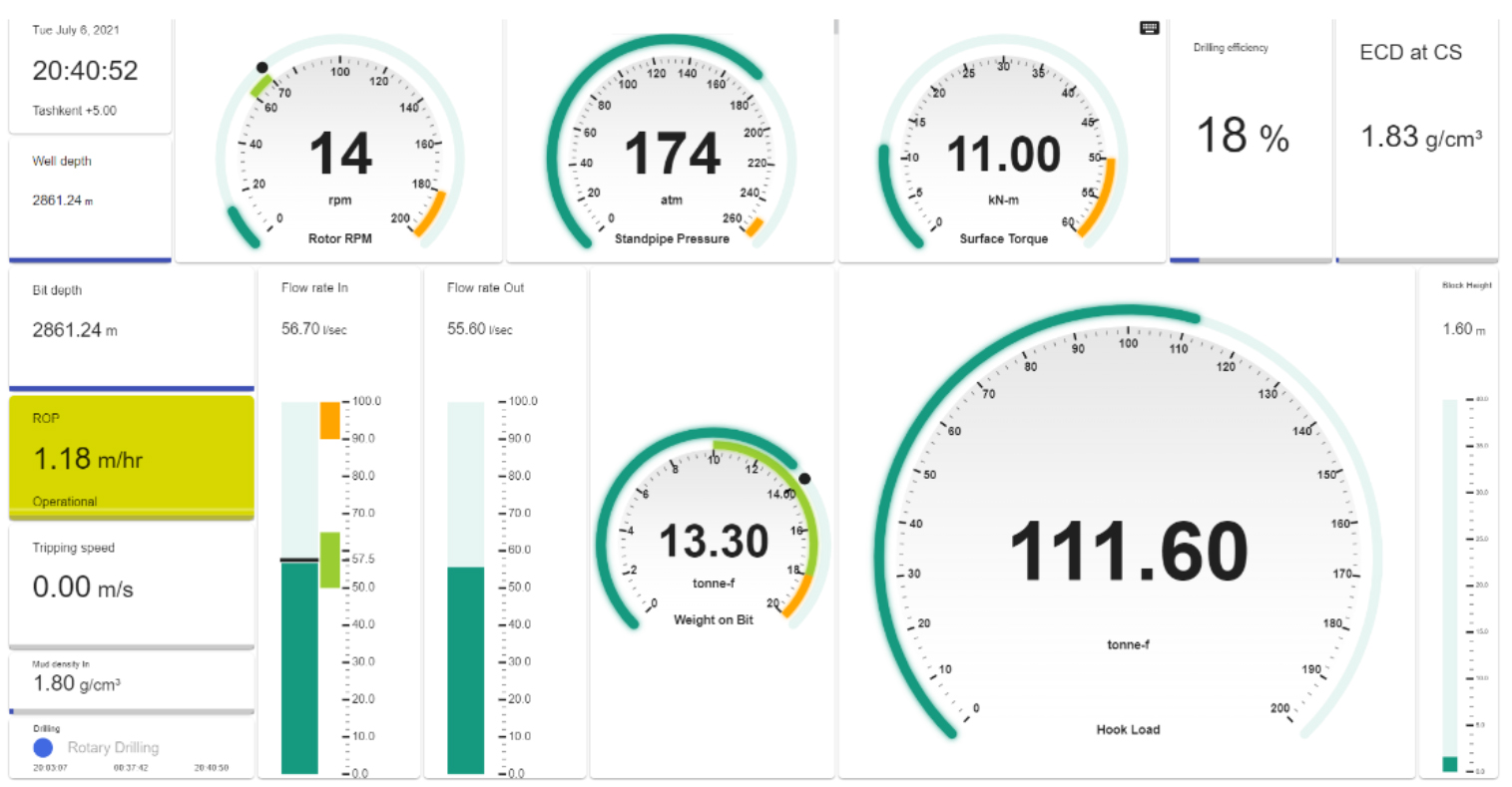 The main tool for preventing accidents in case of violation of drilling technology in ECO is the system of early warnings and alerts. When the limit values of technological parameters are reached, the system notifies on the potential hazard, or drilling dysfunction taking place, recommends, and notifies personnel, sending emails or messages, as well as highlighting the issue on the drillers HMI screen. Driller sees all sensor readings on his display along with dynamically identified associated threshold values and optimal safe working intervals on gauges and logs in real-time.
