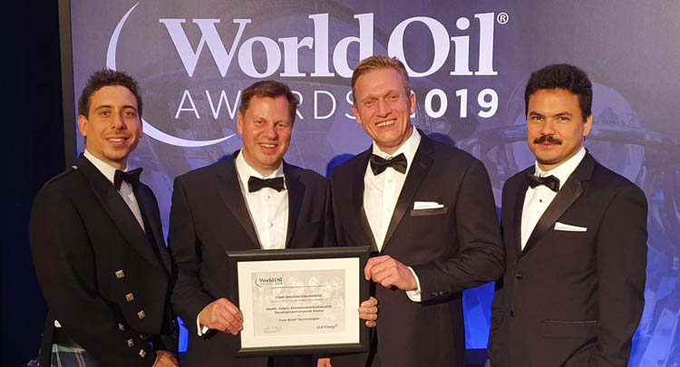 Clear Solutions International is proud to be nominated as finalist for the 2019 World Oil awards – “Best Health, Safety, Environment / Sustainable Development – Onshore Award”, for the 2019 World Oil Awards. We ended runner up in this category, however we are very confident that our Pure-Bore® Performance Technology will take a leading presence in the Oil and Gas industry. As a company we strive for new innovative, differentiating technologies to provide added value, consistent performance, environmental compliance and responsible technologies to the Oil and Gas industry. We are looking forward to next year’s nominations. From Left to Right: Jamie Cliffe, James Mansell, Marc Eigner and Nelson Alfonzo.
