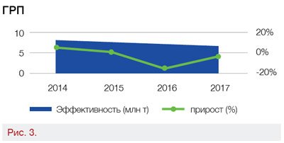 За период после введения санкций и ухода западных компаний с рынка ГРП снизилась эффективность этого направления. Если в 2013 году одна операция ГРП в среднем давала 1,43 тыс. т нефти, то в 2017 году — только 1,12 тыс. т. Вероятно, это следствие технологического и технического отставания российских подрядчиков.