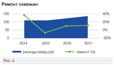 Направление капитального ремонта скважин в 2017 году показало рост в числе операций на 14% до 61 тыс. операций, в денежном выражении увеличилось на 13%, этот рост можно объяснить увеличивающимся количеством новых добывающих и нагнетательных скважин в западной Сибири, требующих обустройства.