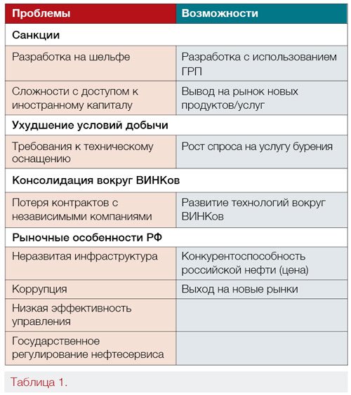 На таблице 1 представлены ключевые вызовы и возможности для нефтесервисной отрасли которые сформулировали наши эксперты. Эти вызовы и возможности являются следствием факторов оказывающих наибольшее влияние на отрасль: санкции, консолидация отрасли, условия добычи (прежде всего в западной Сибири), рыночные особенности РФ.