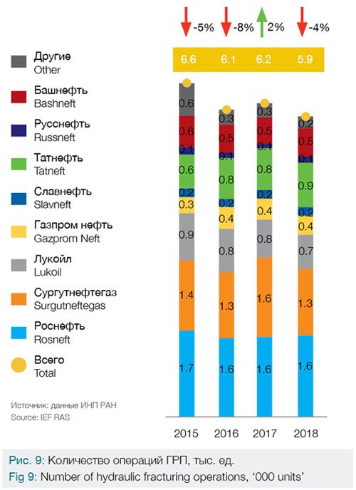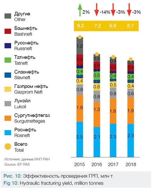 Hydraulic fracturing yield totaled 6.7 million tonnes in 2018, down 3 percent compared with 2017. Despite an overall decline in the number of hydraulic fracturing operations, Surgutneftegas managed to achieve a 6 percent increase in its yield (to 1.9 million tonnes). At the same time, Lukoil saw yield fall 20 percent to 0.6 million tonnes.