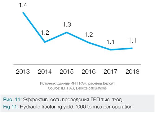 The hydraulic fracturing yield in Russia has been falling over the past few years. In 2013, the average yield was 1,426 tonnes of oil per operation. This figure fell to 1,135 tonnes in 2018. The main reasons for declining yields are insufficient geological knowledge, technological deficiencies and conducting hydraulic fracturing manually.