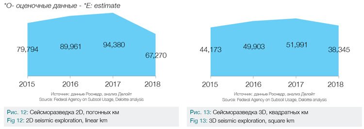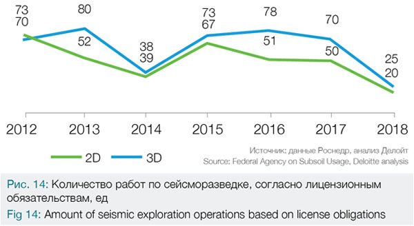 According to license obligations, the amount of 2D and 3D seismic exploration operations fell 60% in 2018 (by 24 and 30 operations respectively).