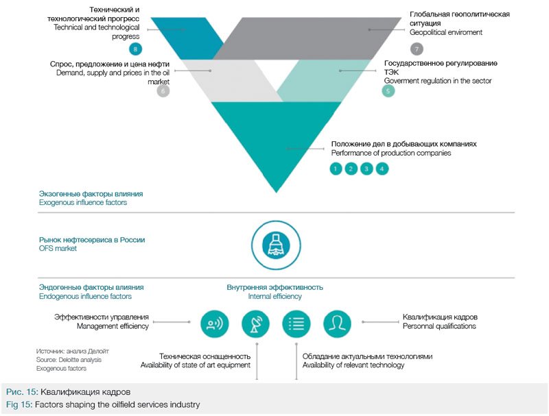 There are two groups of factors: exogenous and endogenous. Exogenous or external factors influence each other, and ultimately the Russian oilfield services market (e.g. government regulation of the industry). Endogenous factors, which affect the market from within, are internal factors that affect the in-house efficiency of market players.
