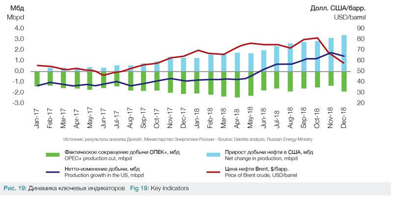 In the first five months of 2018, output cuts exceeded the agreed levels, averaging 2.3 million bpd. However, the OPEC+ signatories returned to average daily cuts of 1.7 million bpd in June-December 2018. Oil prices continued to rise gradually, reaching a peak of over USD 80 per barrel in October 2018.