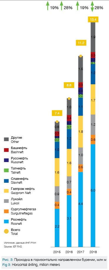 The robust growth in horizontal drilling volumes is a prominent trend on the oilfield services market, increasing three-fold (by 9.1 million meters) since 2013 and rising 19 percent in 2018 alone. Rosneft, which conducts the most drilling (45 percent of the total), is fueling this trend, boosting drilling volumes by 36 percent in 2018.