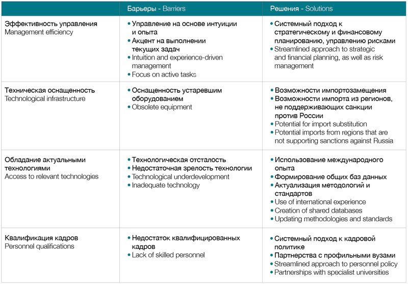 Oilfield services companies in Russia must work on improving internal efficiency to meet the challenges posed by external factors. The table below shows several factors and typical barriers, as well as the tried and tested solutions of Russian and international best practice, which have helped lift companies’ internal efficiency.